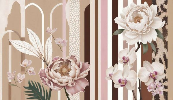 Large peonies and graceful orchids in soft pink and cream tones pair with vertical stripes and elegant architectural arches. The warm palette of beige, powder pink and brown gives the whole thing a stylish, modern and slightly exotic look.