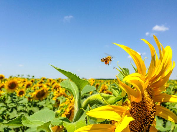 A beautiful image of a flying bee full of pollen near a field of yellow sunflowers.