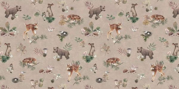 An enchanting forest pattern with playful animals like deer, bears, and rabbits, surrounded by leaves, mushrooms, and other forest details. This delicate design on a calm background brings the magic of the forest indoors, ideal for creating a serene and natural atmosphere in any space.