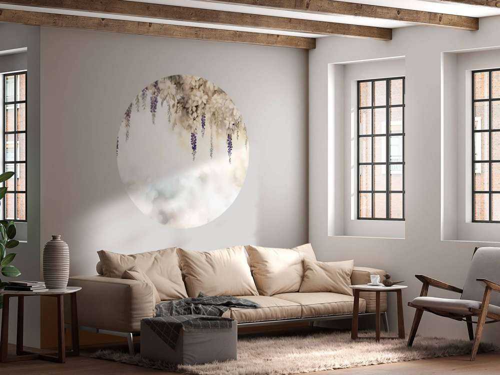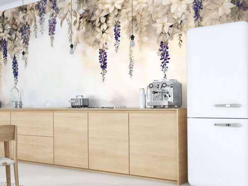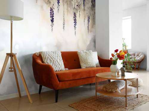 This romantic and refined design brings the enchanting beauty of a blooming garden to life. Lush white jasmine flowers and hanging purple wisteria form an elegant floral ceiling that evokes a soft, dreamy atmosphere. The watercolor-like background, with subtle light reflections and a misty glow, enhances the magical appeal and makes the design feel almost weightless. This design fits perfectly within a classic or romantic interior, where soft colors and natural elements give the space an elegant and serene appearance. In combination with light woods, soft fabrics, and vintage accents, a warm and inviting atmosphere is created. Ideal for a bedroom or a stylish sitting area where a touch of tranquility and refinement is desired. For a more luxurious ambiance, this design can be combined with golden accents, velvety cushions, and marble details, resulting in a chic and timeless whole. It also shines beautifully within a botanical interior, especially when paired with green plants and natural materials like rattan and ceramics. The combination of graceful flowers, soft pastel shades, and atmospheric light creates a versatile and timeless design. Whether applied in a romantic bedroom, a bright entrance, or a serene workspace, it always brings a sense of calm, elegance, and refinement.