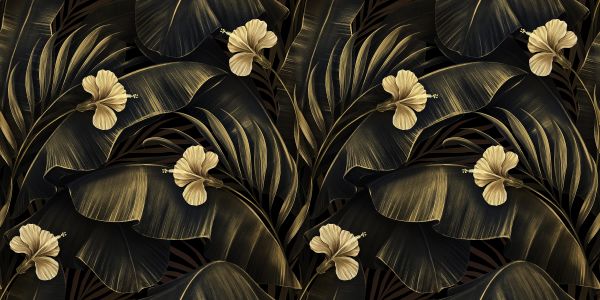 A tropical exotic pattern with golden hibiscus, vintage banana leaves and palm leaves.