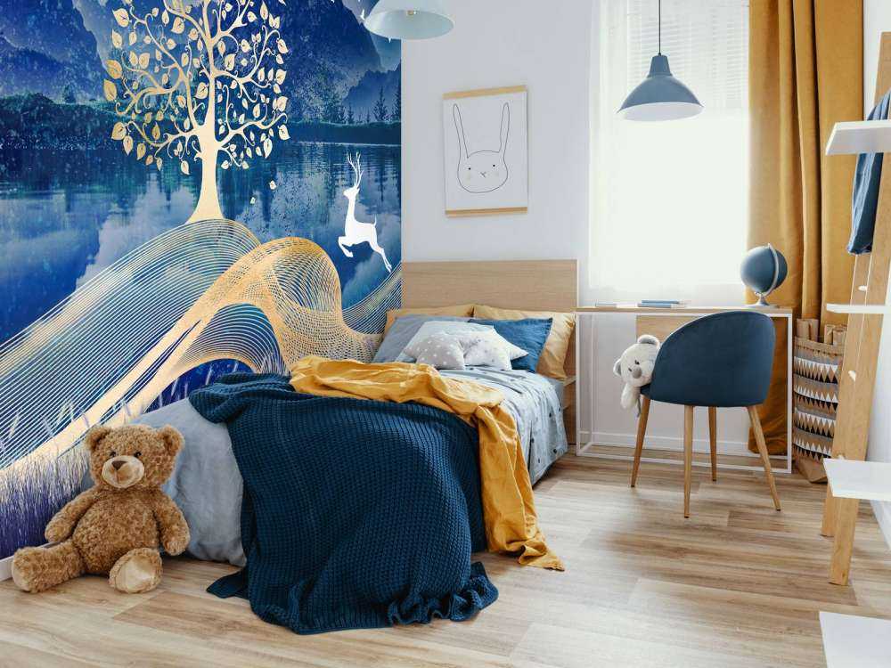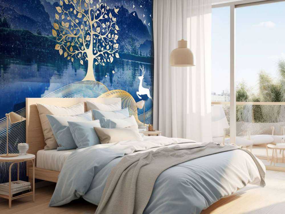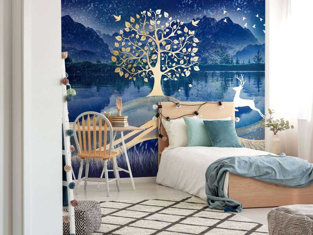 Modern art with a dark blue jungle, white deer, birds and a beautiful golden tree.