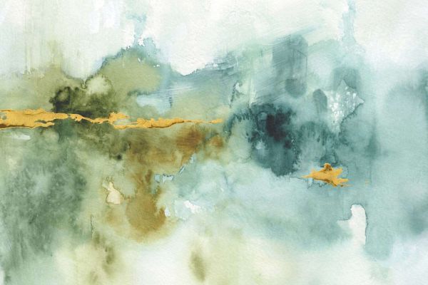 A dreamy watercolor composition in green and blue tones, crossed by a graceful, gold-colored line. The design exudes tranquility and has an organic, natural movement.