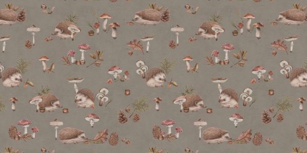 A cute pattern with hedgehogs amidst autumn mushrooms, pine cones, and acorns. The soft taupe background and detailed illustrations create a warm, woodland atmosphere, ideal for adding a cozy and playful accent to any space.