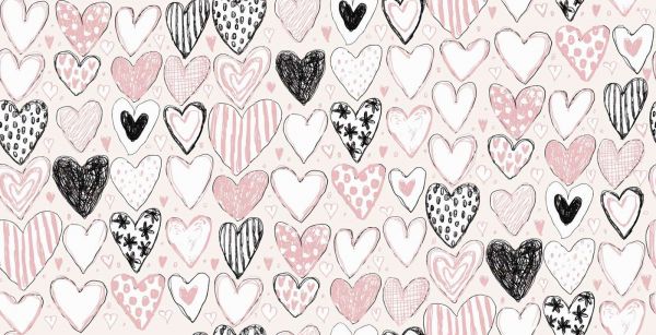 A playful collection of hand-drawn hearts in black, soft pink and white, with various patterns such as stripes, dots and little flowers. The background is subtly pink and scattered with small hearts, giving it a romantic and lively appearance.