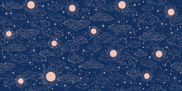 A magical pattern of graceful clouds, stars, and suns on a deep blue sky – perfect for mystical or soothing designs.