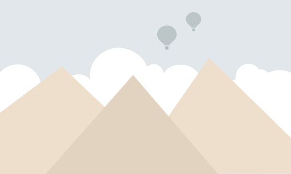 High mountains in beige tones with a blue sky and clouds in the background. Two hot-air balloons float over the mountains.