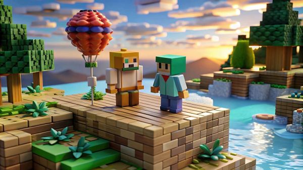 An idyllic pixelated scene with a hot air balloon, two colorful characters, and a landscape filled with wooden platforms, trees, and clear water. The warm glow of the sunset highlights the serene and adventurous atmosphere of this vibrant world.