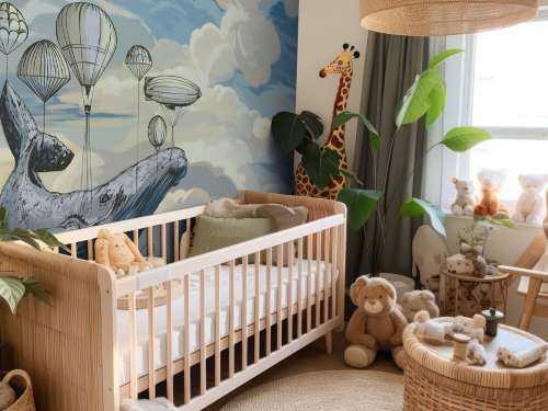 Hot air balloons with a whale flying through the clouds. Combine this wallpaper in a children's room.