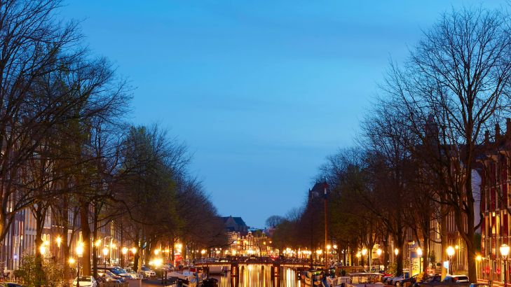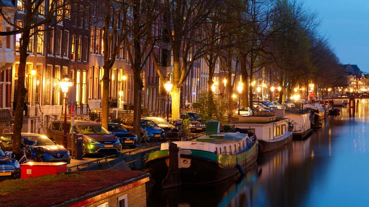 Houseboats along illuminated canal Peel and Stick Wallpaper