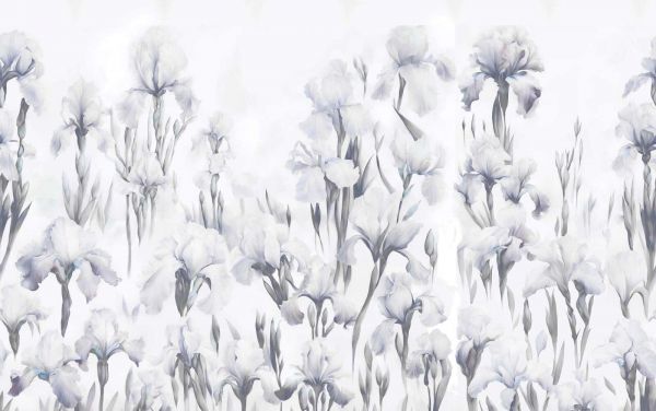Elegant irises in refined gray tones create a timeless and subtle appearance. The soft watercolor technique and delicate brush strokes bring a modern and serene atmosphere to the space.