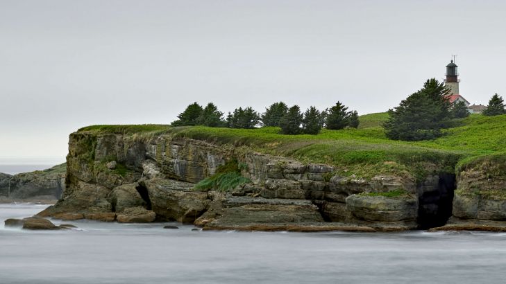 Island in the sea with lighthouse and green vegetation