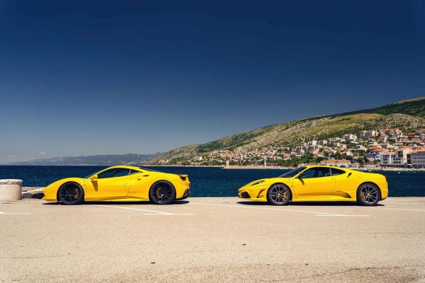 Two iconic yellow Ferraris, the 488 GTB and F430 Scuderia, exude pure power and elegance along the sunny coast. The azure sea and picturesque hills create the perfect backdrop for these Italian masterpieces.