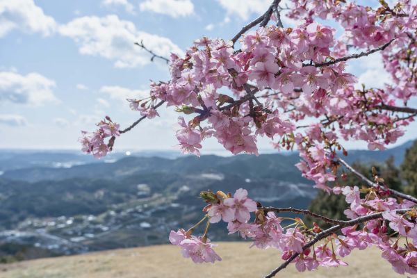 A detailed image of pink Japanese blossoms with mountains in the background.