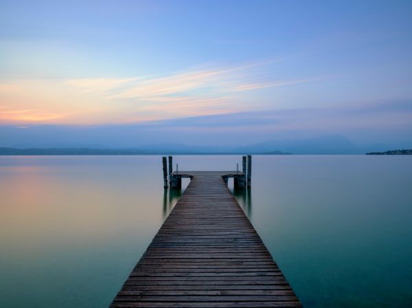 Beautiful wooden jetty at sunset. This photo wallpaper immediately gives more atmosphere to the room.