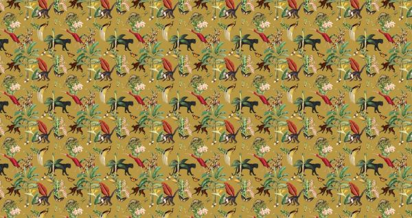 This design immerses you in the dynamic world of a tropical rainforest. The rich ochre yellow background adds a warm and inviting base, while colorful details of animals such as monkeys, birds, and butterflies come together with lush tropical plants and flowers. Each element radiates energy and vibrancy, creating a visually impressive whole. You can beautifully combine this pattern with natural materials such as rattan, bamboo, or warm wood for an organic look. For a luxurious touch, you can work with gold accents or accessories in deep jewel tones like emerald green and ruby red. If you want a modern atmosphere, you can choose sleek furniture in black or white to make the design shine even more. This vibrant jungle pattern is ideal for playful spaces such as a children's room, creative corner, or even an accent wall in the living room. It not only brings color and energy to your interior but also invites you to dream of distant destinations and adventures in nature. Perfect for those who love color, nature, and a unique style.