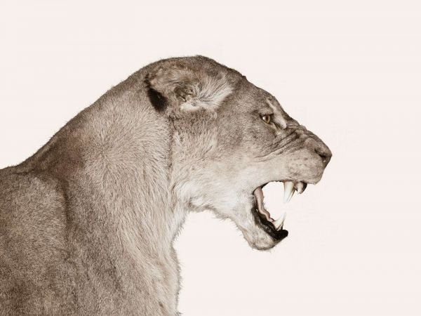 This image shows a roaring lioness in side view against a soft, sand-colored background. The detailed rendering of her taut muscles and sharp teeth emphasizes her strength and determination, while the bright background enhances her imposing silhouette.