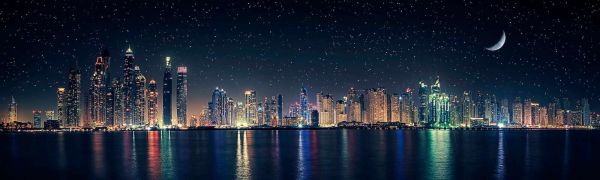 A breathtaking night view of a modern skyline full of light reflections, under a sparkling starry sky with a narrow moon. The colorful glow of the skyscrapers vividly reflects in the calm water.