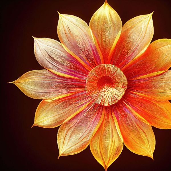 A warm, fiery flower shape radiates in shades of gold, orange, and crimson. The fine veins in the petals provide depth and texture, while the whole seems to glow against a deep, dark background.