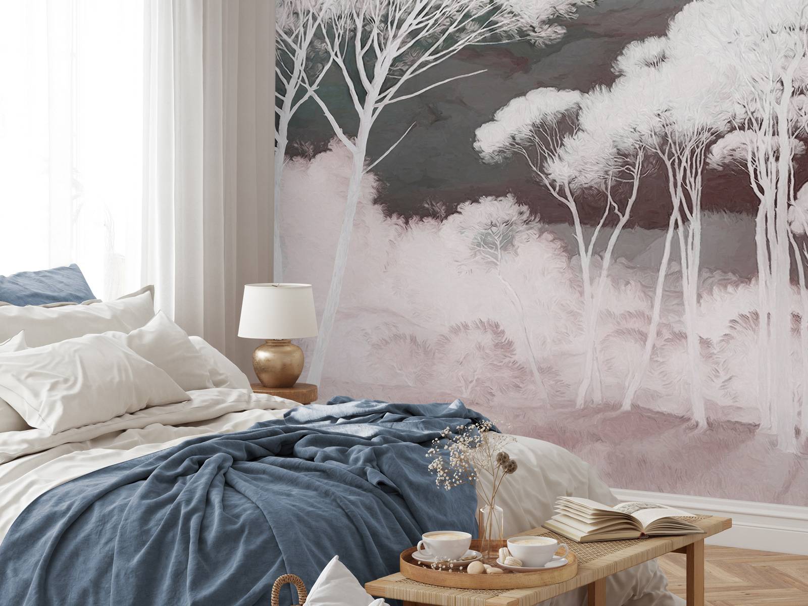 This enchanting design brings to life a serene forest setting with elegant, tall trees stretching towards the sky. The soft color tones, ranging from light shades to subtle shadows, create a soothing and dreamy atmosphere. The delicate balance between detail and simplicity makes this design particularly versatile. It fits perfectly into both modern interiors and more traditional spaces, where it can serve as a calming element. Combine this design with light, natural materials such as wood or linen for a Scandinavian look, or add warm metals and deep colors for a refined and luxurious ambiance. This design is ideal for living rooms, bedrooms or work spaces where relaxation and tranquility are central.