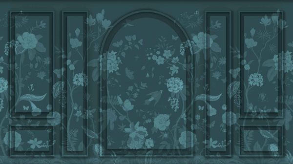 A sophisticated illustration of floral splendor depicted in deep shades of blue against a dark background creates a sense of mystery and elegance.