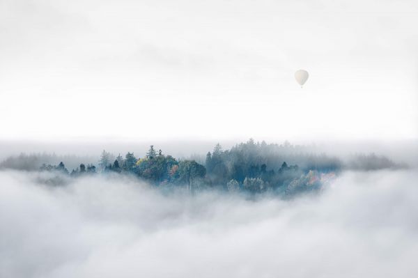 A forest covered by fog. A hot air balloon is visible in the sky.