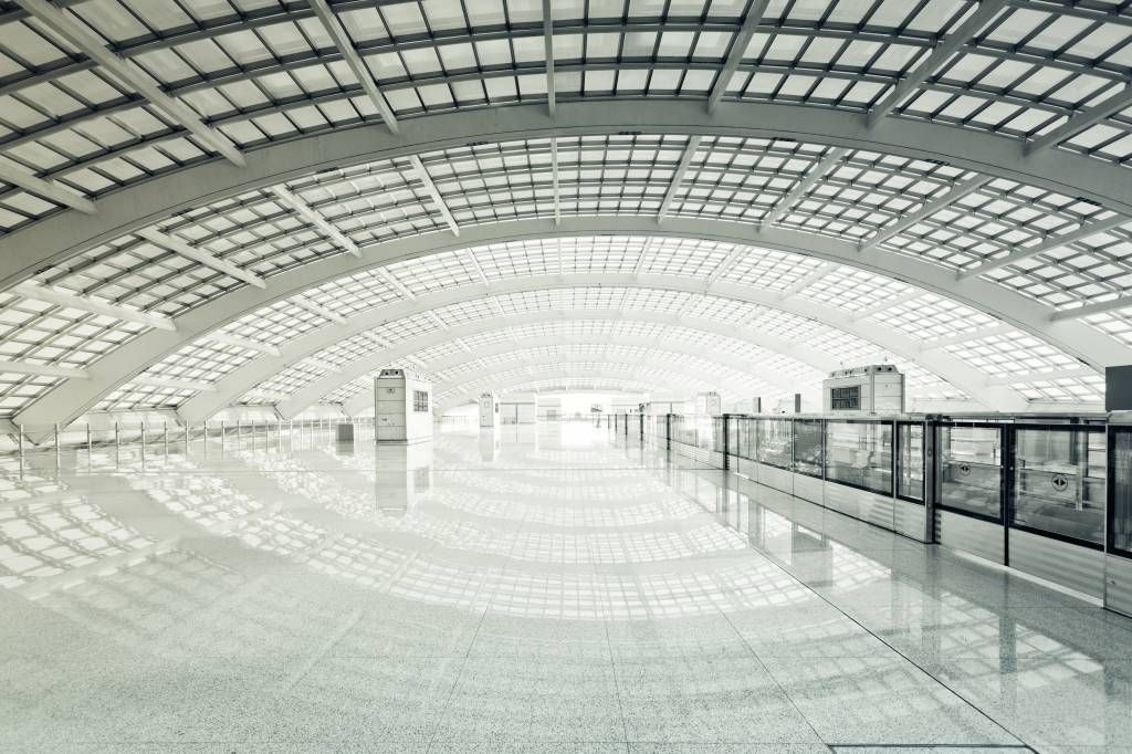 Photo wallpaper with a sleek modern hall with a curve in the floor and a reflective effect