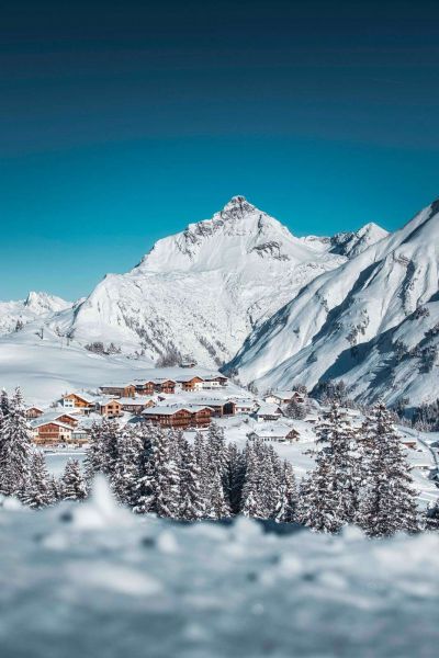 A picturesque mountain village is hidden among snow-covered pines and impressive white mountain peaks. The wooden chalets and clear blue sky create a bright and peaceful winter scene.