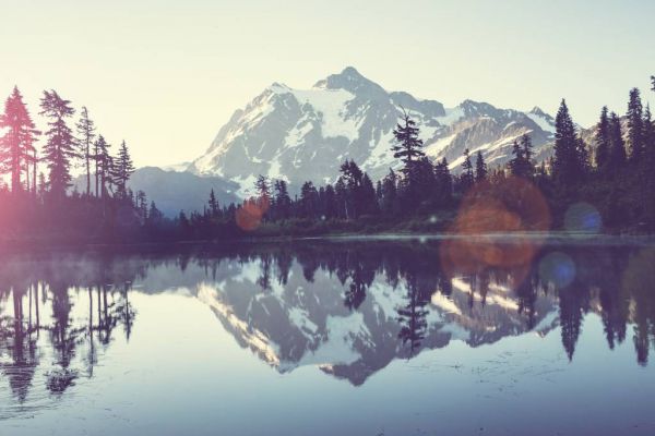 A beautiful mountain lake with snowy peaks in the background and a forest with conifers. A beautiful image for in your bedroom or living room