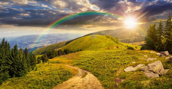 Mountains at a beautiful sunset with a rainbow. With this photo wallpaper in your home, it is as if you can walk straight into this landscape.