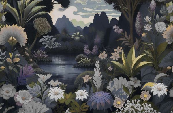 This enchanting landscape shows a tranquil lake surrounded by an abundance of flowers and lush plants. In the background dark mountain peaks rise against a softly lit sky with subtle clouds. The foreground is richly filled with large white flowers, lilac accents, and various leaf structures in deep green tones. The color palette consists of midnight blue, gray-green, cream, and soft purple, which together create a harmonious and somewhat mysterious atmosphere. Within a modern or hotel-chic interior, this landscape forms an impressive focal point. Combine with dark furniture, such as a deep blue or charcoal-colored sofa, and add accents in gold or brass for a luxurious effect. Soft lighting enhances the evening-like character of the scene. Also in an eclectic or botanical interior, this scene comes beautifully into its own. Think natural materials such as wood and rattan, combined with rich fabrics and plants at different heights. Ideal for a living room, bedroom, or even a stylish study where a calming yet pronounced atmosphere is desired. The combination of landscape and flowers provides depth, balance, and an almost fairy-tale-like experience.