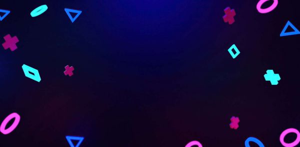 A stylish and modern gaming design with iconic gaming symbols glowing in neon pink and blue against a deep, dark background. The floating geometric shapes create a dynamic and playful effect, perfect for a game room with a futuristic and minimalist look.