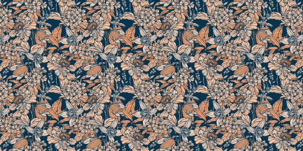 This design presents a dynamic flower field, where the elegance of botanical line drawings on a night-blue background is accented by tones of orange and white. It is an artistic representation that embodies both the stillness of the night and the vitality of nature.