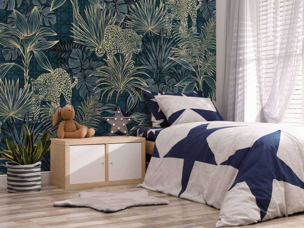 Panthers in the jungle in blue and gold. With this pattern, transform the nursery into a true jungle room.