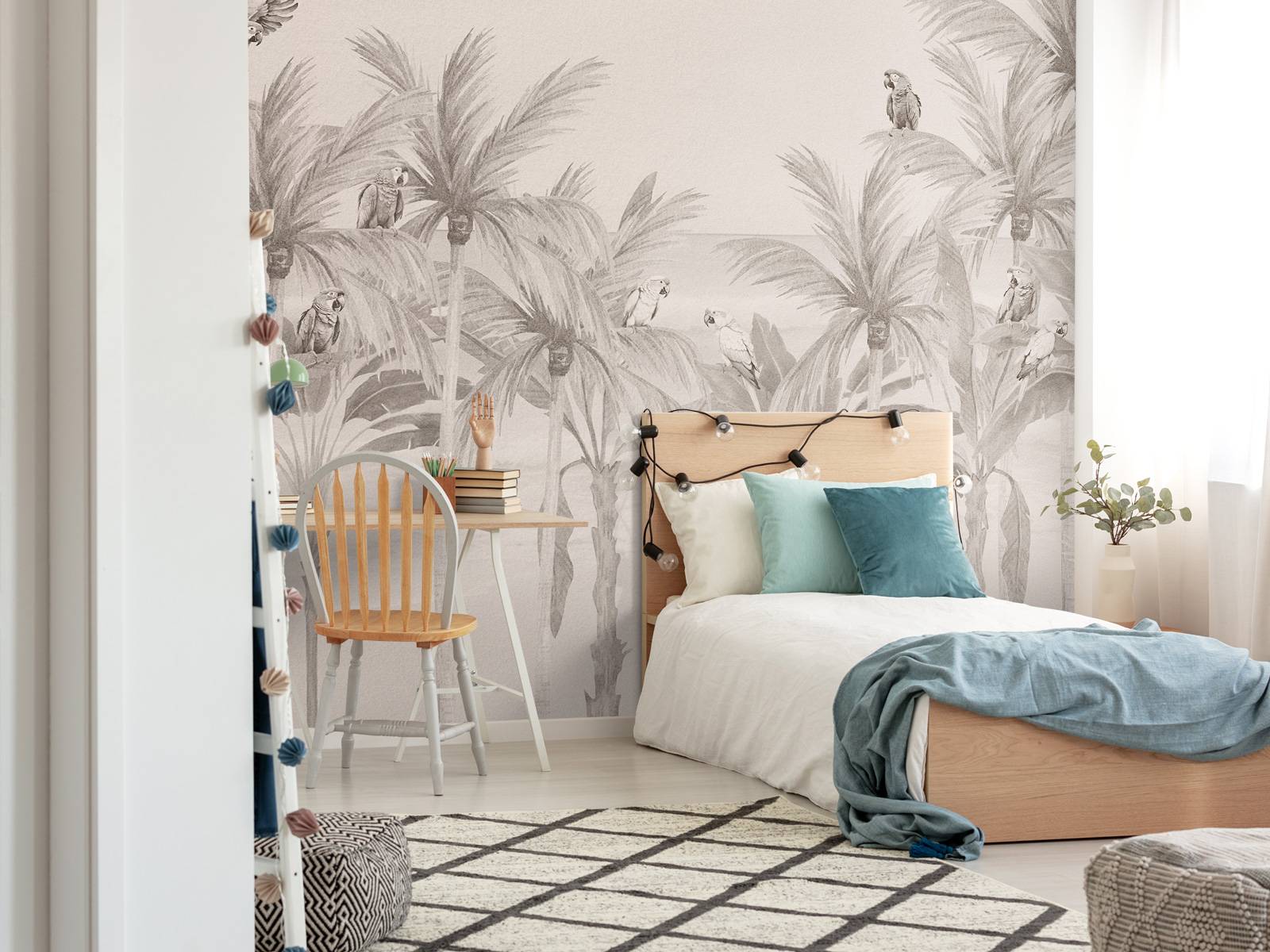 An exotic collection of parrots nestled among the lush leaves of tropical palm trees. The design plays with gray shades that give depth to the palm leaves, while the parrots add a playful dynamic to the composition. A pattern that evokes both the spirit of the tropics and a sense of serene simplicity.