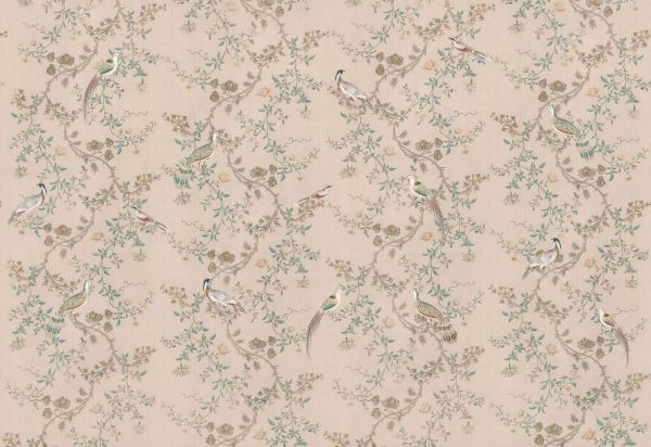 Light pheasants in soft green tones rest gracefully among winding flower branches, delicately drawn on a warm beige background. The pattern exudes a classic elegance with subtle colors like pastel green, old pink, and taupe.