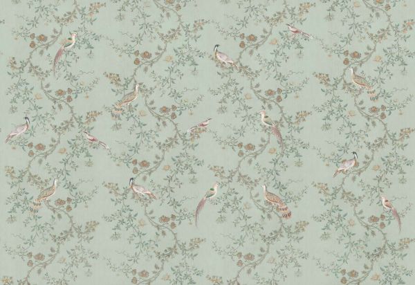Elegant pattern of decorative pheasants resting on refined flower branches, framed by a soft green background with subtle, natural accents in old pink, ochre, and jade. The illustrative style gives the whole a classic and sophisticated look with a romantic, almost fairytale-like character.