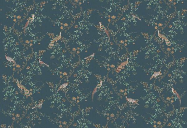 This enchanting design combines majestic pheasants with a lush floral setting on a deep midnight blue background. The birds are depicted realistically with vibrant colors such as jade green, copper, cream, and soft pink. The winding branches and delicate flowers form an elegant, repeating pattern that exudes both tranquility and opulence. The golden-brown accents in the flowers enhance the feeling of luxury, while the contrasting green tones anchor the design in a natural atmosphere. Perfect for an eclectic or classic interior where rich colors and refined details are appreciated. In a classic decor, this design comes to life beautifully alongside velvet fabrics, dark woods, and antique brass accents. In a more eclectic setting, you can combine it with bold accessories, geometric shapes, and a mix of vintage and modern furniture for a dynamic effect. The deep color tones create a warm, intimate atmosphere that is particularly suitable for spaces such as a reading nook, bedroom, or stylish study. This pattern also works as a focal point with a theatrical flair in an elegant hallway or luxurious dining area. Pair this design with furniture in dark wood or black metal and opt for fabrics in velvet or linen in warm colors like ochre, burgundy, or olive green. Accessories in gold or bronze enhance the luxurious character, while large indoor plants accentuate the natural look.