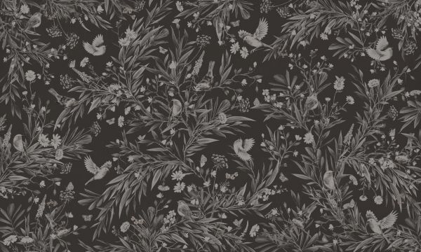 This enchanting design captures the tranquility of nature at night. Against a deep black background unfolds a delicate interplay of flowers, leaves, and small songbirds, depicted in soft gray tones with subtle light-dark contrasts. The robins glide through the image or rest on branches, surrounded by daisies, grasses, wildflowers, and butterflies. The overall effect is reminiscent of an old botanical engraving with a modern twist. The monochromatic color scheme creates a subdued, almost poetic atmosphere. The detailed illustrative style gives the design richness and depth, without being overwhelming. The dark background lends an air of elegance and sophistication to the design, subtly illuminating the light lines and shapes—as if bathed in moonlight. Perfect for a modern classic interior or a stylish eclectic interior with depth and character. Combine with materials such as velvet, dark wood, marble, or brass for a luxurious feel. Also beautiful with lighter furniture and natural elements to soften the contrast. Highly suitable for a bedroom, library, boutique hotel, cozy hallway, or an intimate hospitality environment. The design exudes tranquility, class, and a connection to nature, ideal as a statement wall with a soft allure. A nocturnal ode to nature—serene, dreamy, and timelessly beautiful.