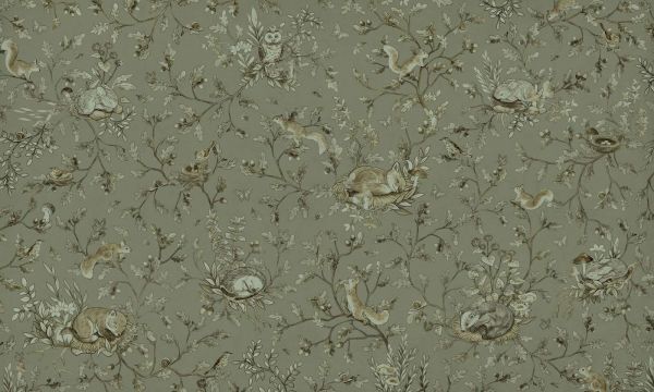 This dreamy design captures the silence of the forest in soft, natural tones. On a warm olive green background unfolds an imaginative landscape full of calm and detail. Among winding oak branches, acorns, and wildflowers, forest animals rest in their nests: rabbits sleep on a bed of leaves, owls watch from a high branch, squirrels playfully jump among the greenery, and birds nestle snugly in their burrows. The illustrations are meticulously crafted with fine lines, giving the whole image a hand-painted, vintage look.