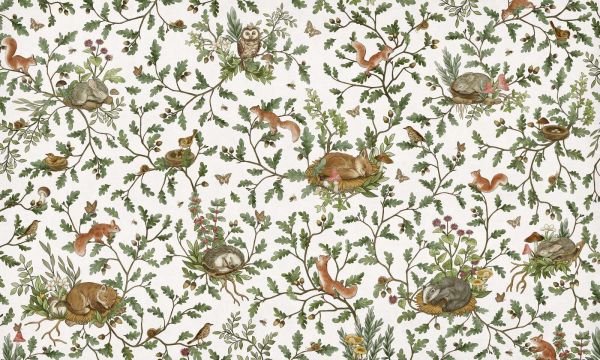 In this lively design, peace and nature come together in a playful way. Among fresh green oak leaves and branches with acorns and wildflowers, you will find a colorful group of forest animals: rabbits sleeping on moss beds, squirrels frolicking through the branches, an owl keeping watch, and songbirds in cozy nests. The light background brings out every detail clearly and gives the design an open and friendly look.