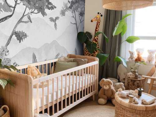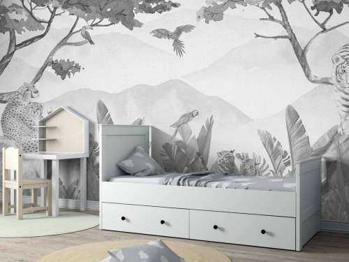 Predatory animals drawn in jungle grey. Hip and trendy wallpaper for the baby or toddler room.