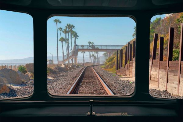 A sunny coastal landscape with palm trees and a railway line, seen from a train window. The warm light and tropical atmosphere evoke a sense of travel and freedom.