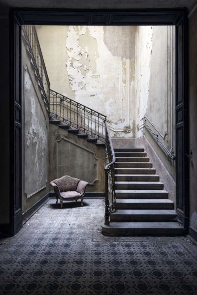 The picturesque staircase of a gigantic villa on the edge of the Italian Alps. The armchair invites one to linger and exudes a certain tranquility.