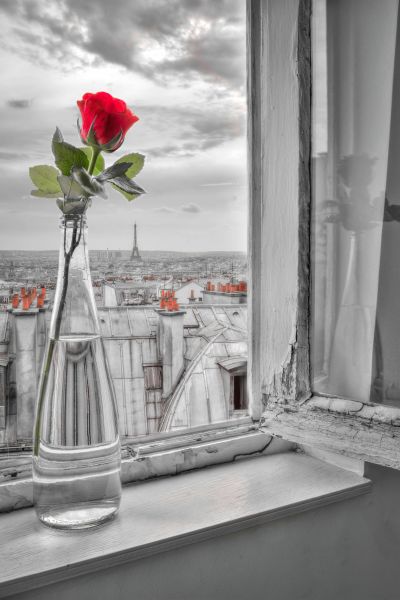 A red rose at the window with the Eiffel Tower in the background. The photo is in black and white, with red colours as detail.