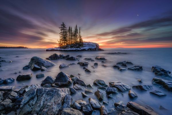 Risen on photo wallpaper. Beautiful sunrise behind an island with pine trees.