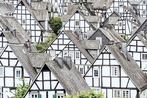 This striking design shows a fascinating grid of traditional half-timbered houses, as found in historic villages in Germany or the Ardennes. The facades consist of a tight pattern of black wooden beams and white plaster, interspersed with slate roofs in shades of gray. The image appears almost abstract due to the repetition of pointed rooflines, square windows, and diagonal elements, while still exuding warmth and heritage.