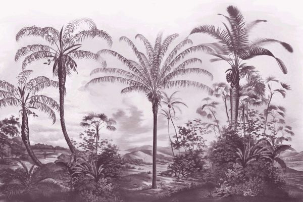 In this tropical design, deep red shades blend with the soft contours of palm trees and hills, evoking a sense of luxury and refinement. The warm burgundy and wine colors subtly contrast with the lighter pastel tones, creating a vibrant yet harmonious scene. This design is particularly suitable for interiors that could use a stately or romantic touch. Think of classic or art deco styles, with dark wooden furniture, marble details, and velvet fabrics in matching colors. Even in a modern interior, this print can create an exciting contrast when combined with sleek, light furniture. The rich colors and tropical shapes invite atmospheric lighting, such as wall lamps in brass or gold. In the living room, this design provides a warm and luxurious welcome, while in the bedroom it creates a sultry, relaxing atmosphere. With this pattern, you bring a piece of tropical grandeur into your home.