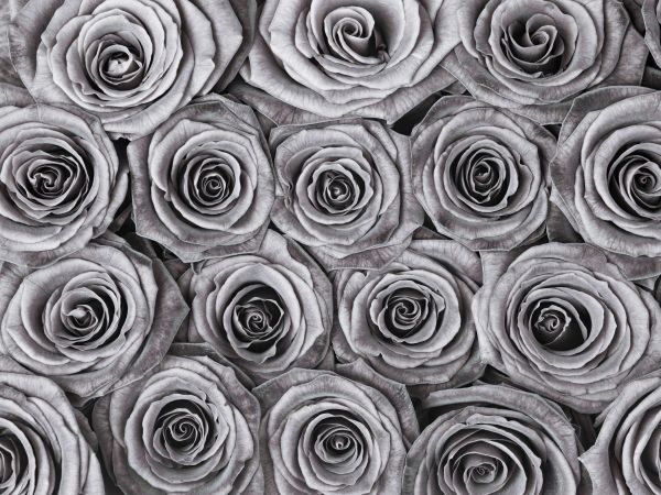 A field of roses is transformed into a grayscale palette, celebrating the essence of their form. The delicate gradations of light and dark reveal the velvety texture of the petals and the hypnotic patterns they form. This image invites contemplation and admiration of natural geometry.