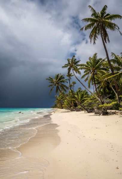 See the storm coming on photo wallpaper. A beach with palm trees, clear blue water and a storm.